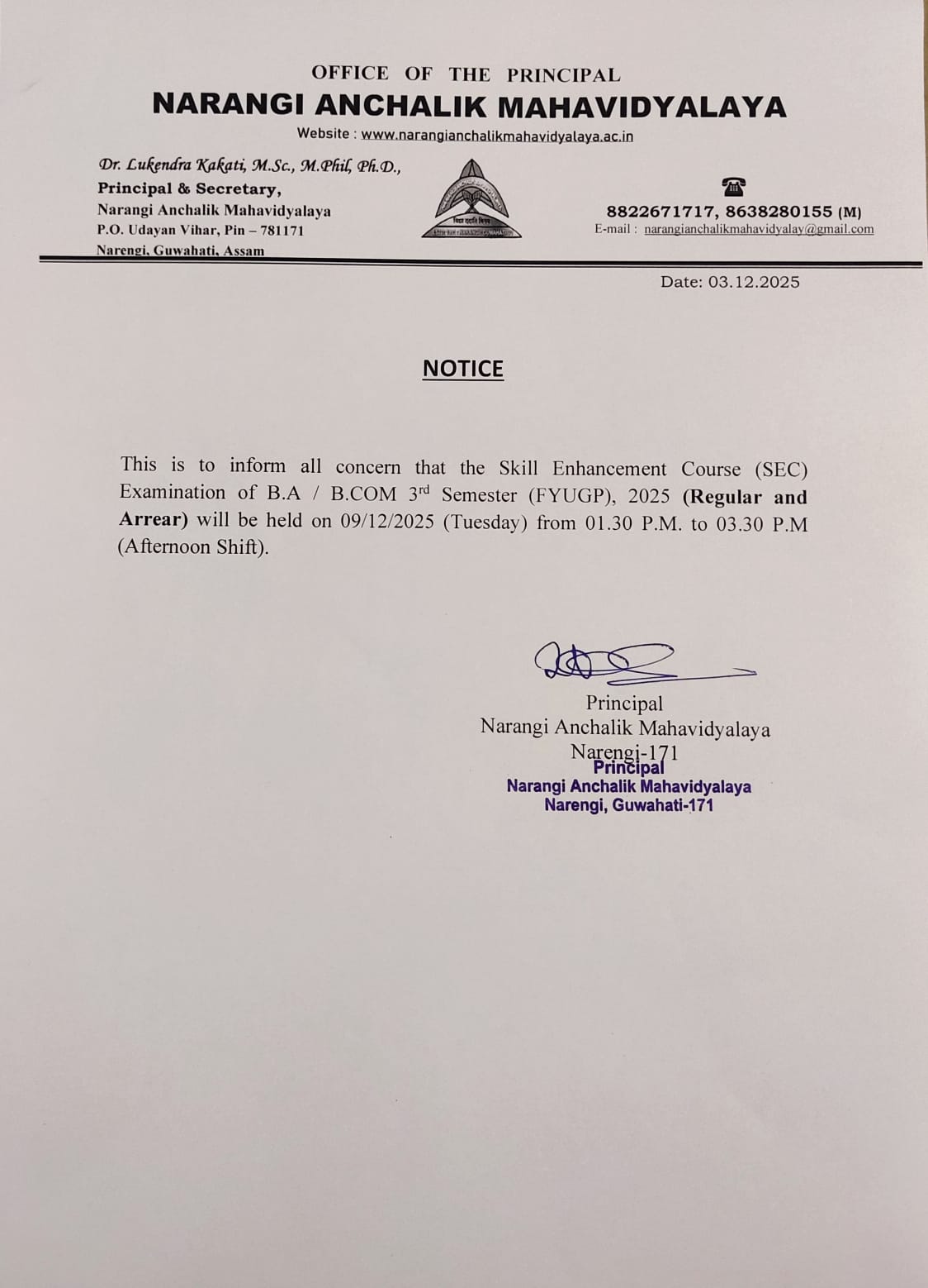 - Notice Regarding Skill Enhancement Course (SEC) B.A/B.Com 3rd Semester, (FYUGP) 2025 (Regular and Arrear) Examination. View